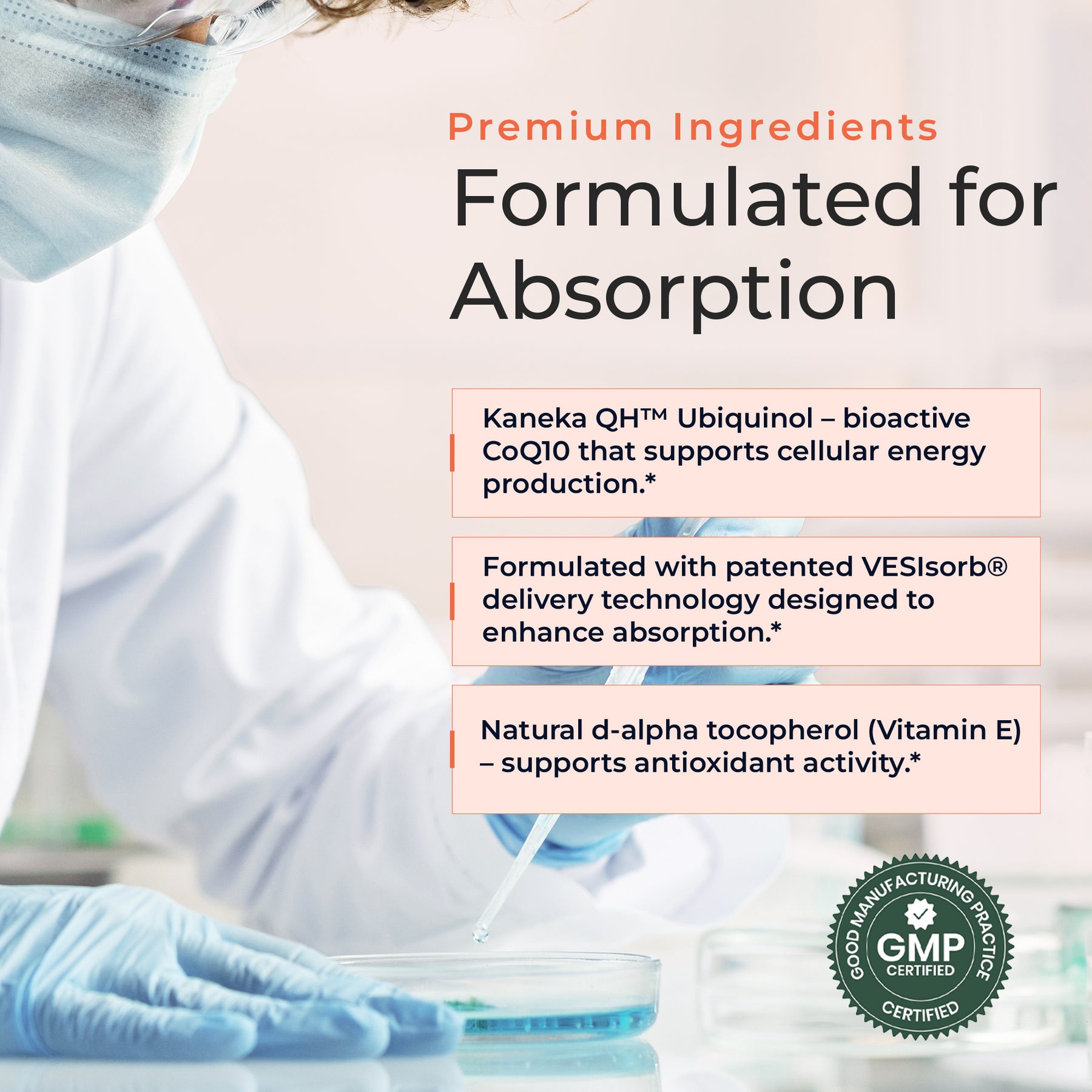 Provides 100 mg of Kaneka QH® ubiquinol, the active form of CoQ10, to support cellular energy production and antioxidant activity, especially important as natural CoQ10 levels decline with age.*