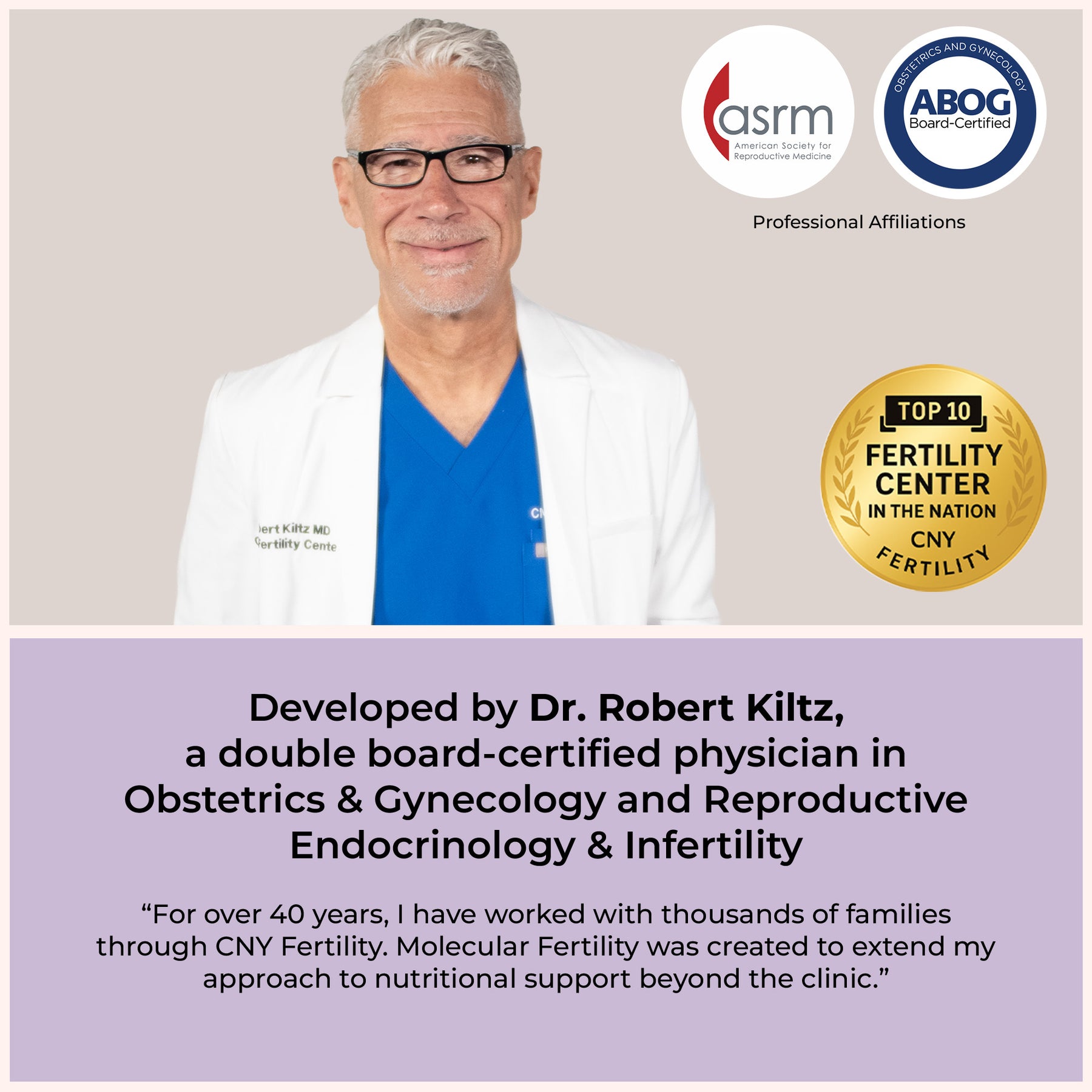 Developed by Dr. Robert J. Kiltz, a double board-certified physician in Obstetrics & Gynecology and Reproductive Endocrinology & Infertility, this formula supports mitochondrial function, cellular energy, and reproductive wellness for both men and women.*